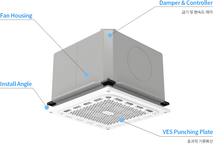 자체 내장되어 있는 Blower와 고성능 먼지 집진 필터(High Efficiency Particulate Arrestance Filter)를 통해 공기 중의 미세 오염물질을 포집/정화하여 실내로 급기하는 기본 유닛입니다.