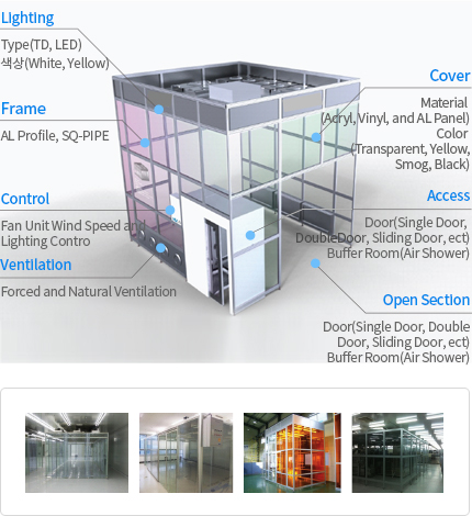 - This booth implements an independent clean environment (cleanliness, air current, temperature/humidity, vibration intensity of illumination, etc.) in various production situations.