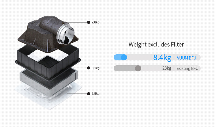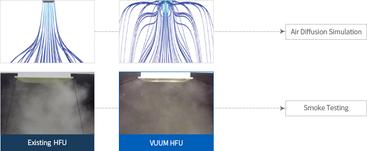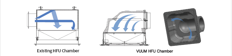 Reduces the number of filters for the same area by the diffusion of air current through HFU Reducing the number of filtters for the same area leads to reduction of cost