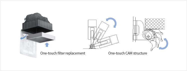 The one-touch CAM structure allows the user to replace the filter with as much ease as possible. The mold production system ensures the strict control of measures applied, thereby eradicating the possibilities of leakage.